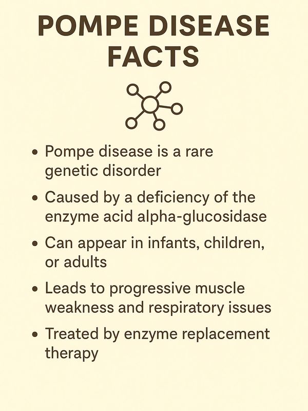 Treatment: Enzyme replacement therapy (ERT) is available and can significantly improve the lives of those with Pompe disease, though it is not a cure.